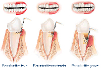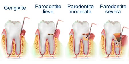L'infiammazione, quando si cronicizza, rigurda in primis le gengive che si distaccano dal dent, si formano delle tasche parodontali che a loro volta danneggiano l'osso alveolare con la sua riduzione e perdita di stabilità dell'elemento dentario.